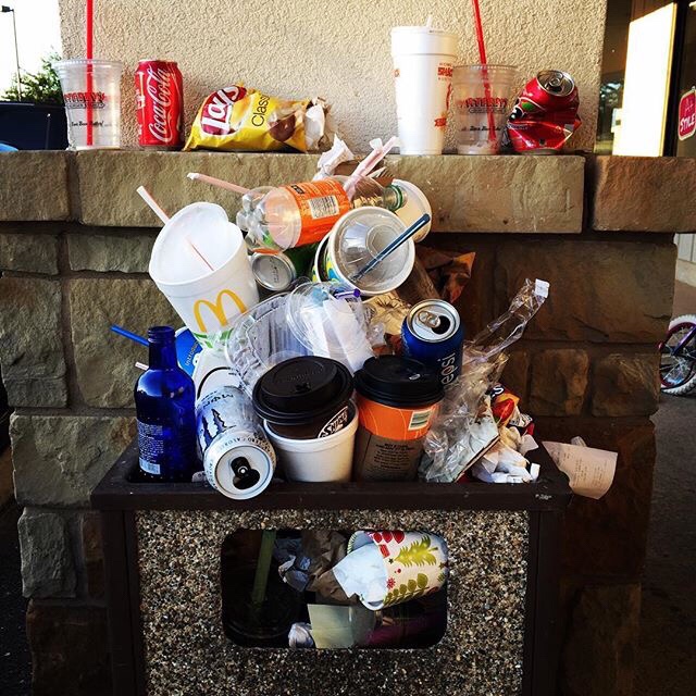 The addition of just one more plastic straw or paper receipt could bring this precariously-crafted trash colossus crashing to the floor. Thankfully, facilities management chose to install an overflow ledge. #blessed