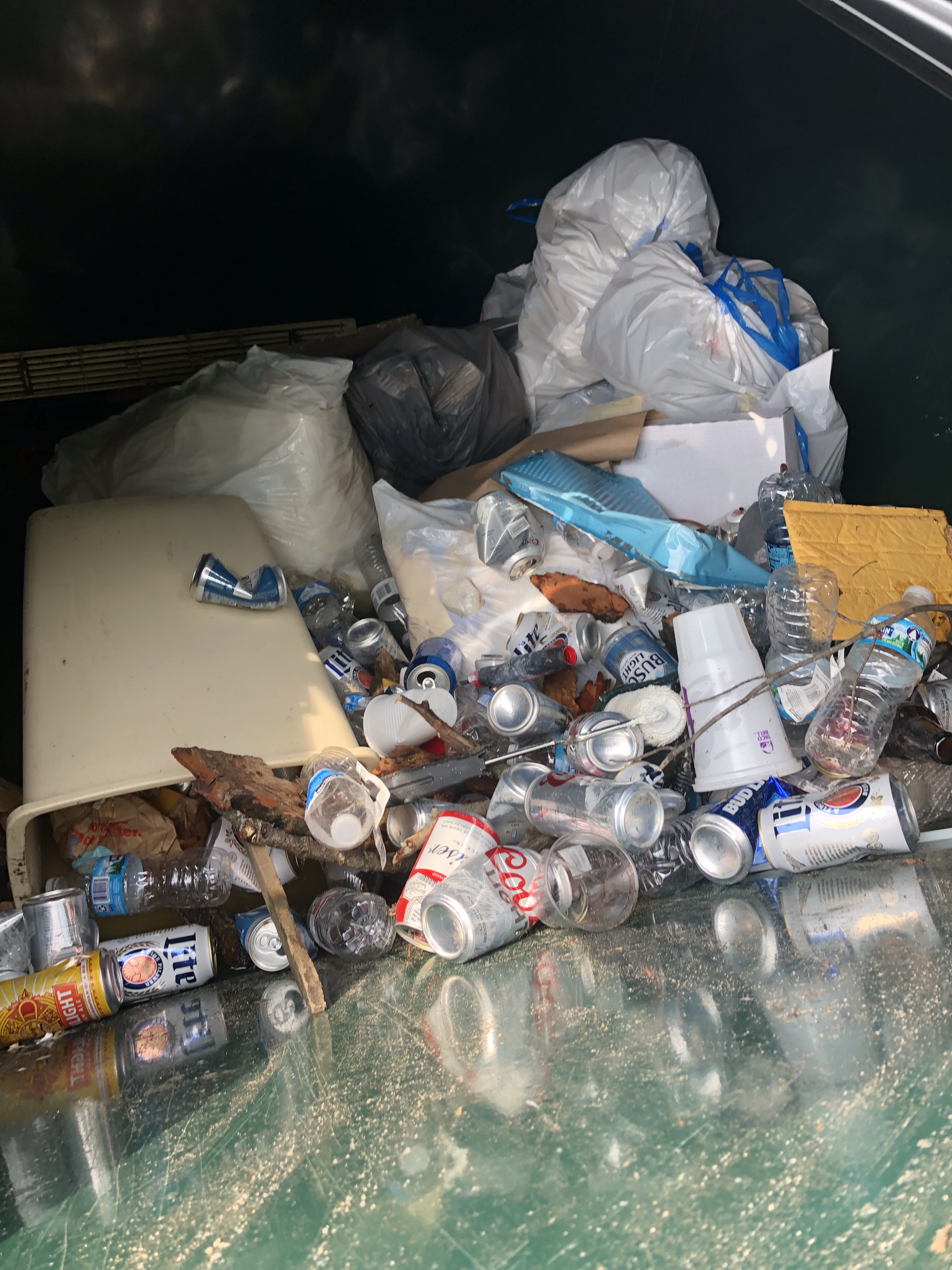 Dumpster trash in a semi-remote location, no recycling option apparent. Too lazy to take my trash contributions (recycling-eligible trash) home for proper recycling.